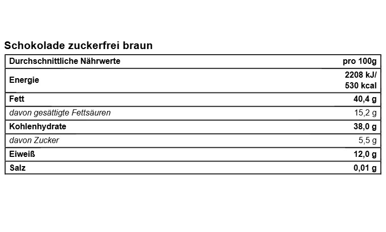 - Kakao, Birkenzucker (Xylit)*, Mandeln, Kakaobutter, Zimt