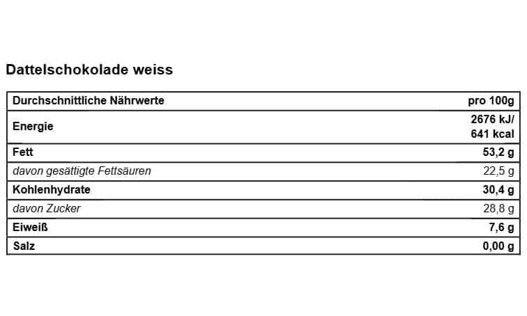 Anstelle von herkömmlichem Zucker ist diese weisse Schokoladentafel mit Datteln gesüsst. Es sind lediglich drei Inhaltsstoffe vorhanden.